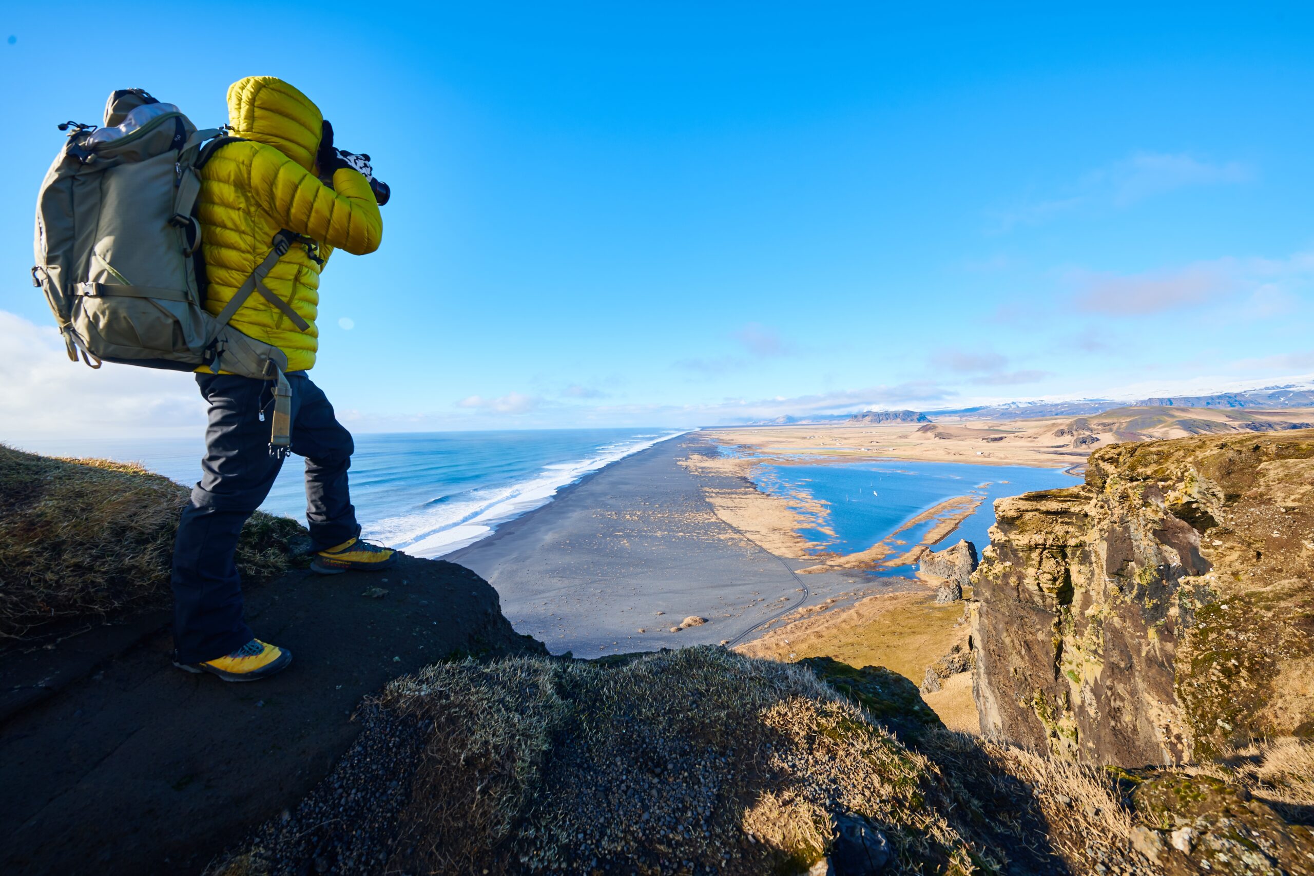 A male wearing a yellow jacket standing on a rock while taking a picture of the beautiful scenery